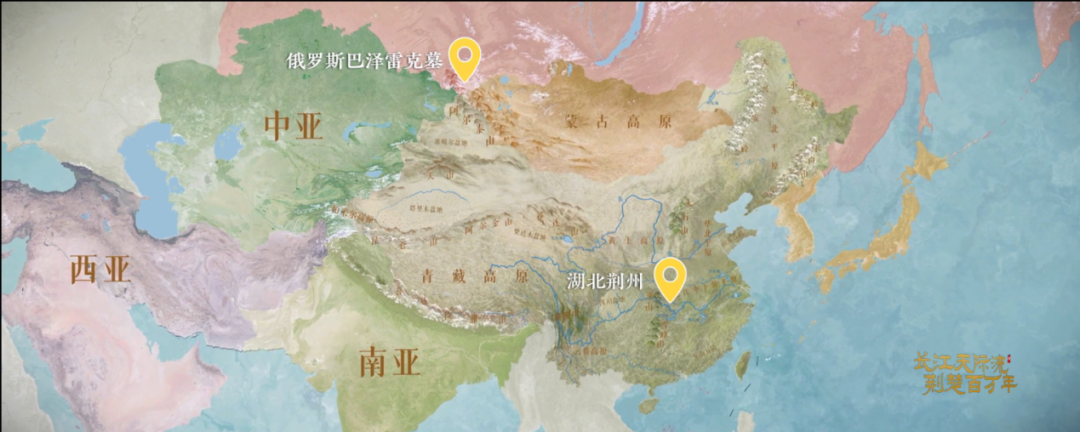 距离湖北4000多公里,俄罗斯阿尔泰山区的巴泽雷克墓葬群之中,曾发现了与荆州楚墓几乎“孪生”的系列文物遗存。凤鸟丝绸的花纹样式、刺绣手法,山字纹铜镜的典型特征、铸造方式,几乎一模一样。