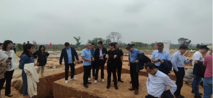 4月13日下午专家组赴石家河遗址现场参观考察,湖北省文物考古研究院赵阳介绍了石家河遗址历年的发掘情况和最新的考古成果,带领专家组参观了三房湾遗址展示保护现场、石家河古城西城墙和考古工作站。专家们对于石家河遗址的文化因素、文化发展、辐射范围水利系统、文化更迭等方面展示了浓厚的兴趣,引发了热烈的讨论。