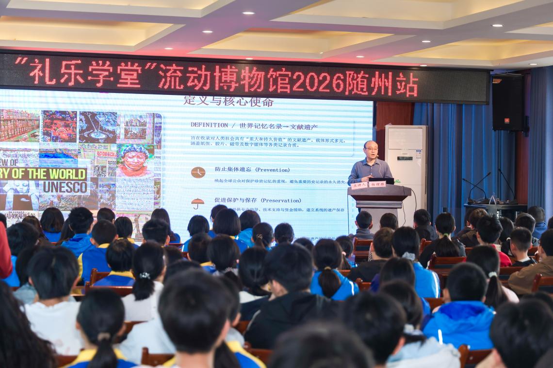 首先,一场干货满满的讲座开讲啦!湖北省博物馆副馆长杨理胜博士登上讲台,为擂鼓墩初级中学的同学们带来“世界记忆名录与曾侯乙编钟”专题公益讲座。什么是《世界记忆名录》?申报需要满足哪些条件?曾侯乙编钟凭什么能入选?杨馆长从这些问题入手,一层层“解密”,带同学们探秘曾侯乙编钟入选背后的“通关密码”。大家听得入神,仿佛跟随杨馆长一起穿越回两千多年前,亲身感受那穿越时空的礼乐回响与古人智慧。